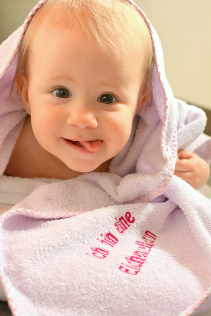 Als kleines Willkommensgeschenk erhalten die jungen Eltern zur Geburt ihres Kindes von der Gemeinde ein kuscheliges Badetuch mit gesticktem Schriftzug.