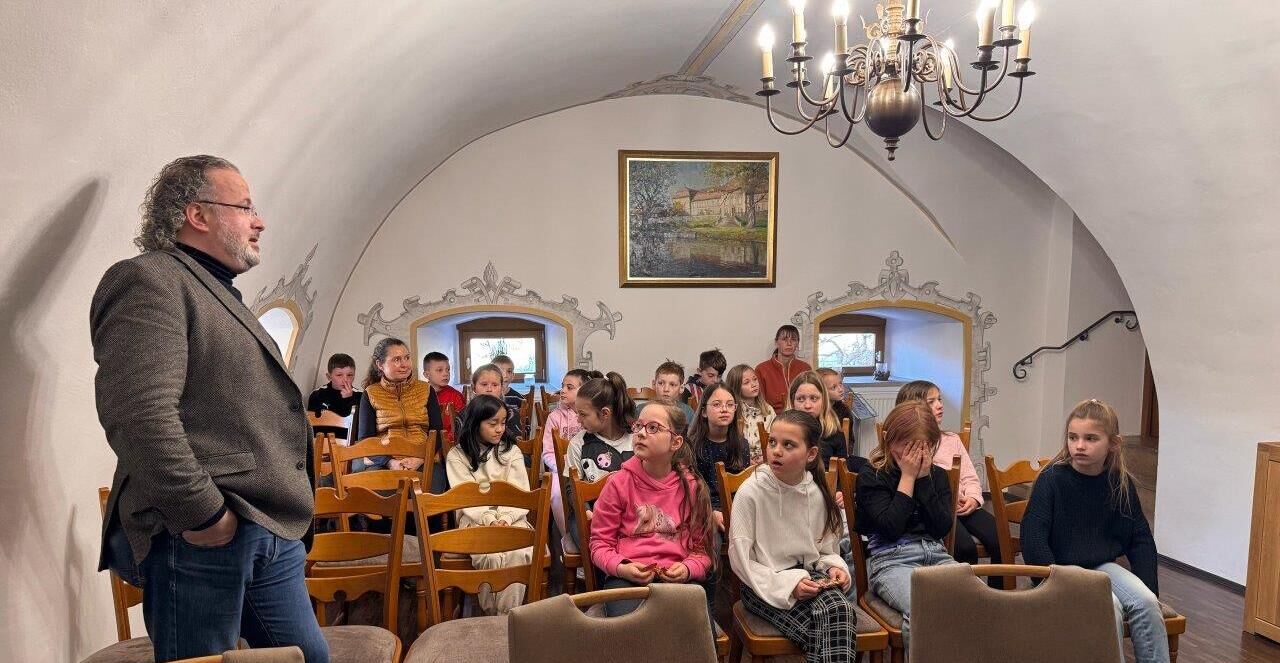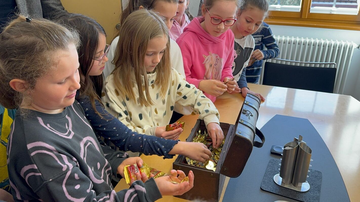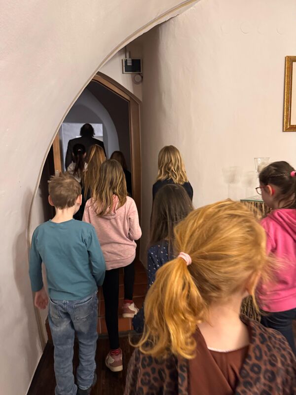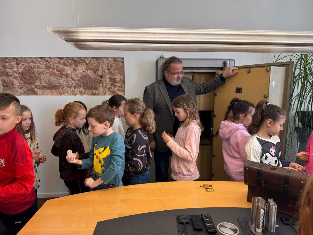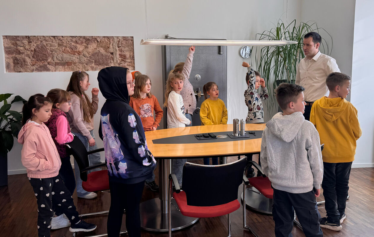 Im Rathaus gab es eine herzliche Begrüßung durch Frau Gärtner und die Kinder trafen im großen Kultursaal ihren Bürgermeister Johannes Rothmund, den sie nun mit interessanten Fragen interviewten. So erfuhren sie unter anderem, dass das schöne historische Schlösschen schon fast 500 Jahre alt ist, Lütter und die anderen Ortsteile seit 1971/72 zur Großgemeinde Eichenzell gehören und was ein Bürgermeister so alles zu tun hat. Auf die Frage, was er an seinem Amt am coolsten findet, antwortete Herr Rothmund, dass er jeden Morgen erstmal eine Tasse Kaffee genießt und es dann toll und interessant findet, viele Menschen zu treffen und sich auszutauschen. Übrigens erzählte er, dass er selbst einmal Schüler an der Grundschule in Lütter war. Nach dem Interview stand noch ein sehenswerter Rundgang im Schlösschen an. Neben dem alten Gefängnisraum in einem der Schlosstürme war der alte Tresor im Bürgermeisterbüro das absolute Highlight.
