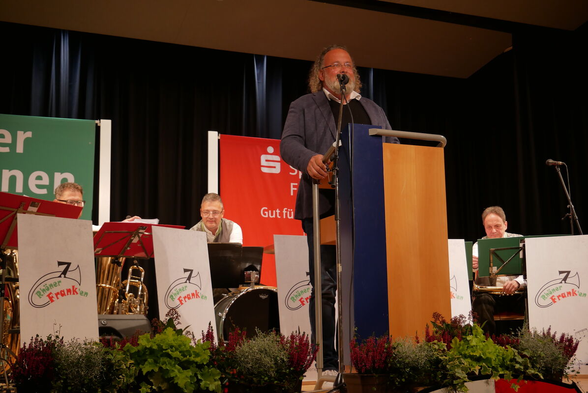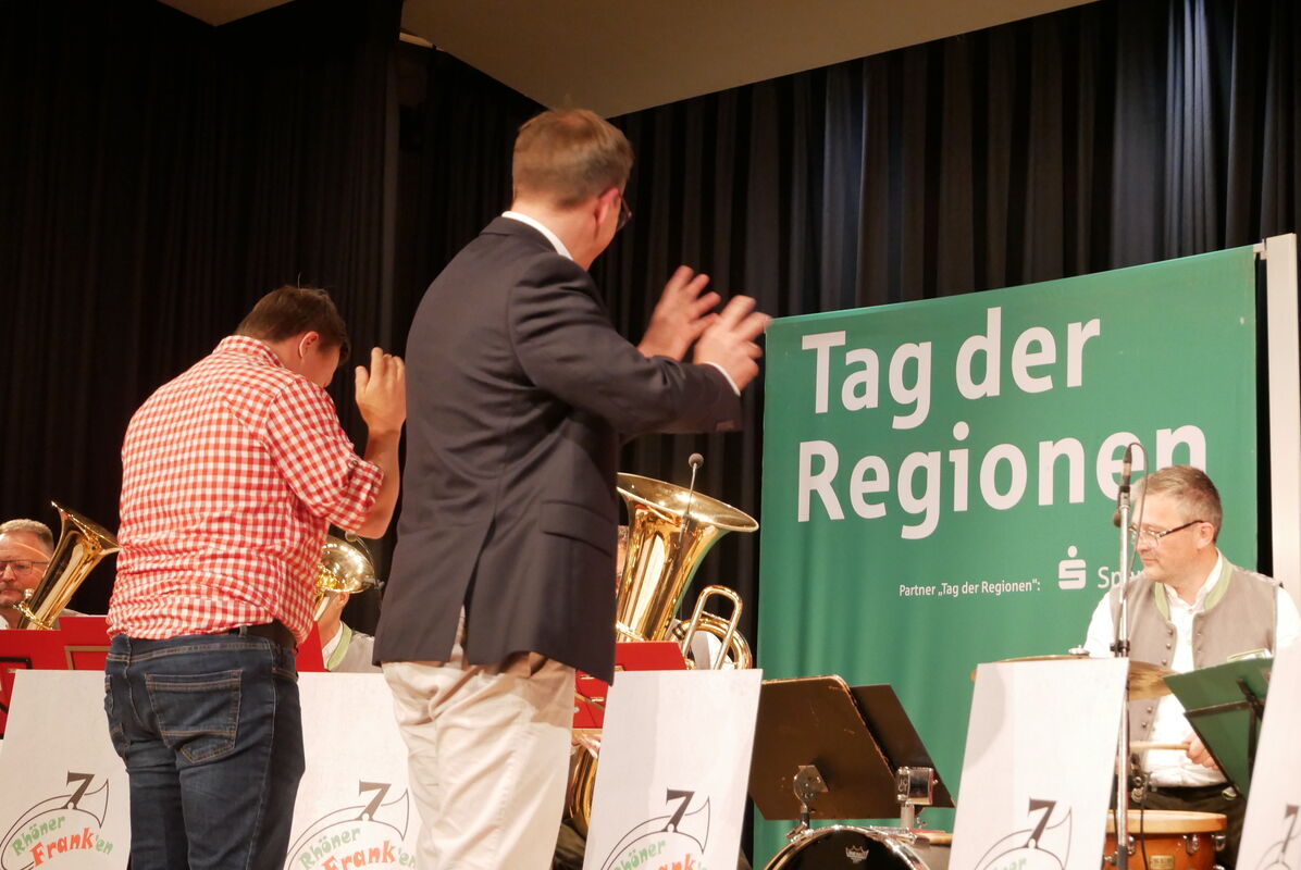 Bevor den Rhöner Franken mit ihrem eindrucksvollen Repertoire aus traditionellen und neuen Elementen der Blasmusik die Bühne gehörte, eröffnete Eichenzells Bürgermeister Johannes Rothmund offiziell den Tag der Regionen, welcher jedes Jahr in einer anderen Gemeinde unter dem Dach des Regionalforums Fulda Südwest stattfindet. 2024 war Bad Salzschlirf an der Reihe, außerdem zählen Flieden, Großenlüder, Hosenfeld, Kalbach und Neuhof zu den letztjährigen Veranstaltern. Eichenzell war zuletzt 2016 an der Reihe – und wie schon vor neun Jahren legt die Gemeinde auch in diesem Jahr wieder den Fokus auf die Musik. „Traditionell gehören die musikalischen Konzerte für uns zum Tag der Regionen“, erklärte Rothmund in seiner Eröffnungsansprache und betonte die Wichtigkeit der Zusammenarbeit der Gemeinden innerhalb des Regionalforums: „Wir haben in den letzten 25 Jahren Millionen Euro in die Kommunen geholt. Aber es geht nicht nur um das Finanzielle, wir stimmen uns auch in ganz vielen anderen Themenbereichen ab, und das ist in den heutigen Zeiten immer wichtiger. Da geht es auch um die Landes- und Bundesebene und vor allem um die Sache an sich, Parteizugehörigkeiten spielen da keine Rolle.“