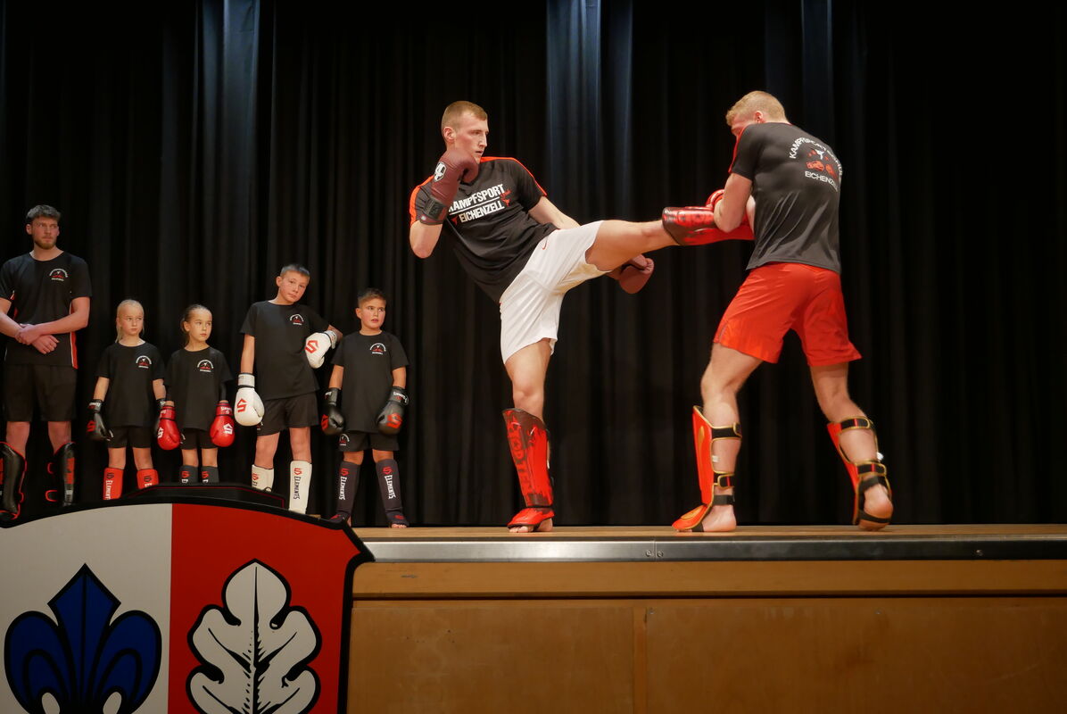 Die zahlreichen Ehrungen wurden von zwei Showakts umrahmt. Ein Höhepunkt des Abends war die beeindruckende Darbietung der Kampfsportschule Eichenzell. Die Sportlerinnen und Sportler zeigten ihr Können beim Kickboxen, beginnend mit Aufwärmübungen über Techniktraining bis hin zu einem spannenden Showkampf, der das Publikum fesselte.