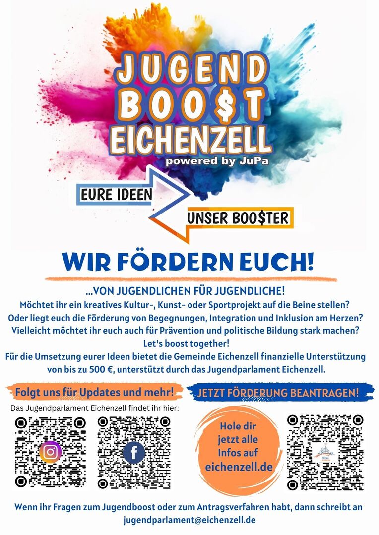 Informiere dich jetzt unter folgendem Link: https://www.eichenzell.de/de/gemeinde/kommunalpolitik/jugendparlament/jugendboost/