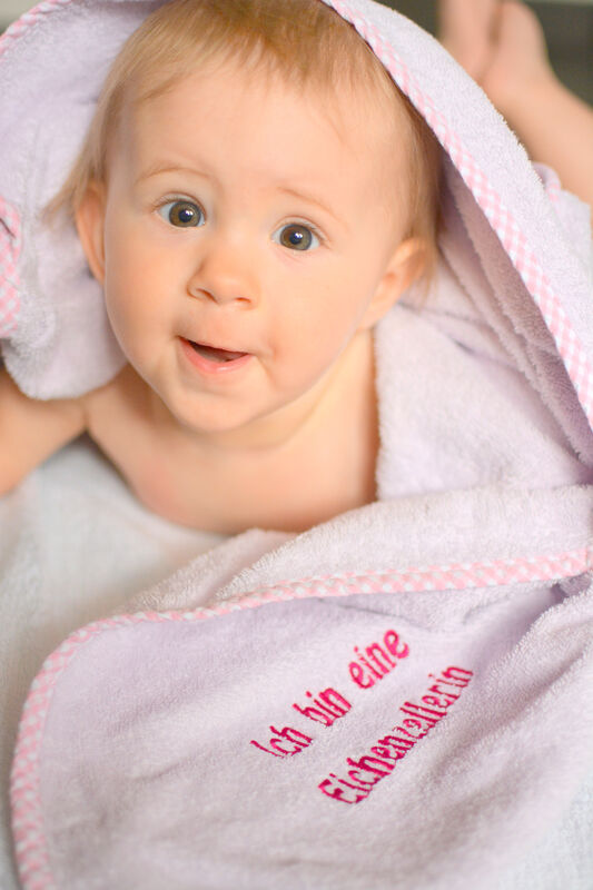 Als kleines Willkommensgeschenk erhalten die jungen Eltern zur Geburt ihres Kindes von der Gemeinde ein kuscheliges Badetuch mit gesticktem Schriftzug.