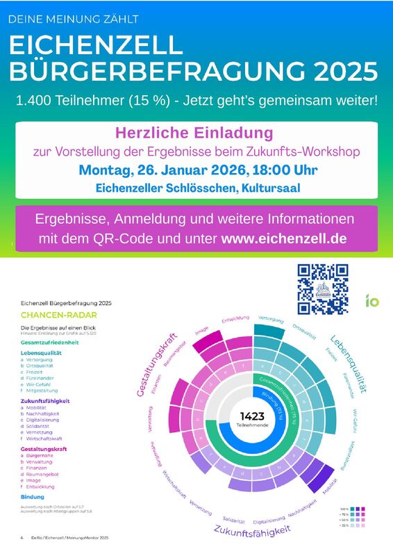 Über 1.400 Eichenzellerinnen und Eichenzeller (15 % der Bürgerinnen und Bürger ab 15 Jahren) haben an der Befragung teilgenommen. Herzlichen Dank an alle, die ihre Einschätzungen und Ideen eingebracht haben.Das Feedback aus der Bürgerschaft ist ein großer Schatz – und zugleich unser gemeinsamer Auftrag, daraus die richtigen Schritte für die Zukunft abzuleiten.
