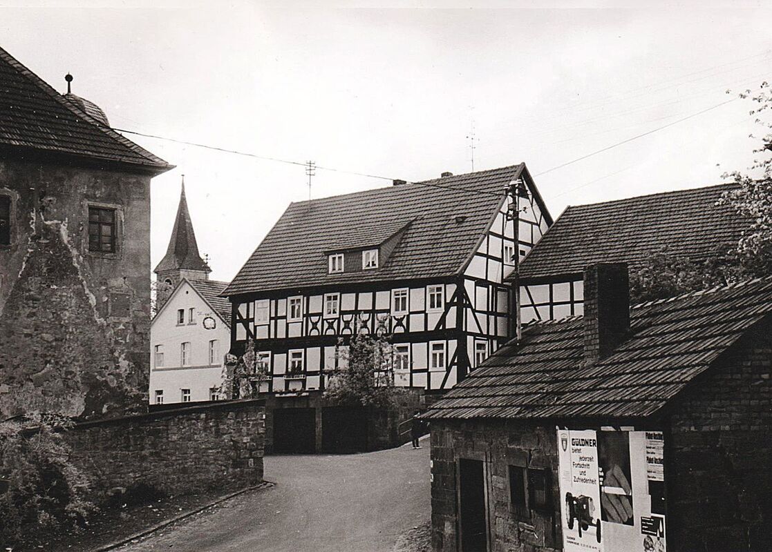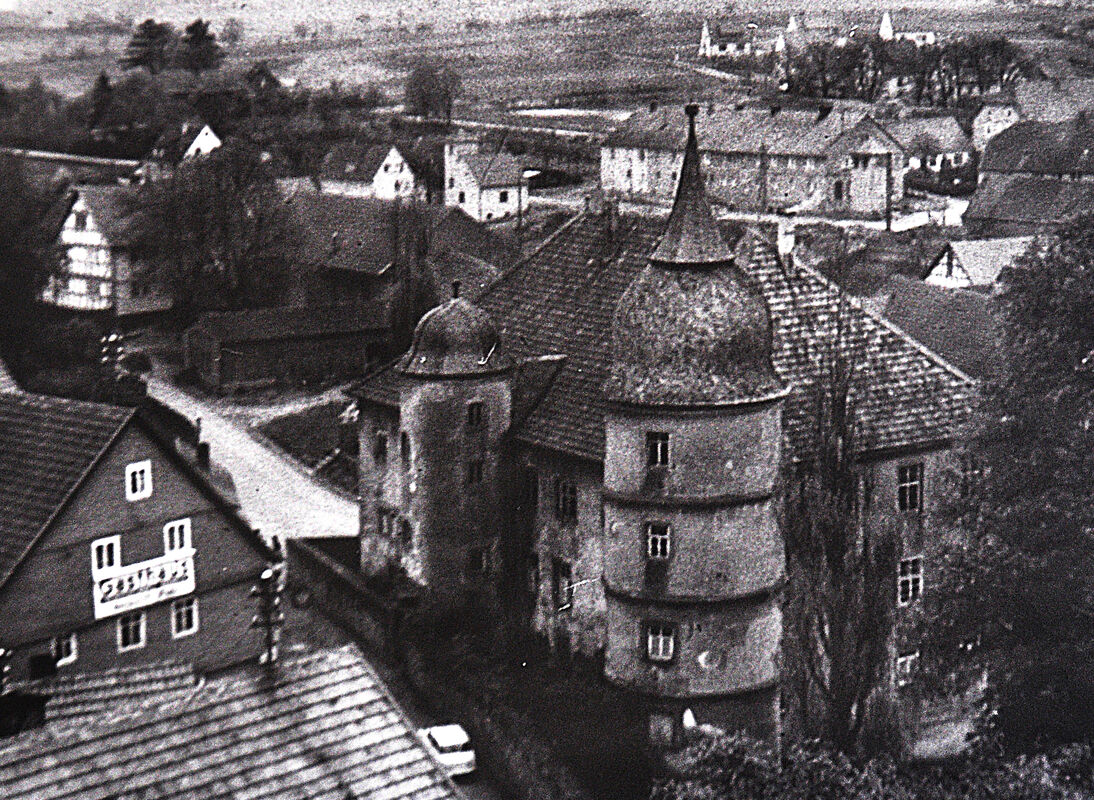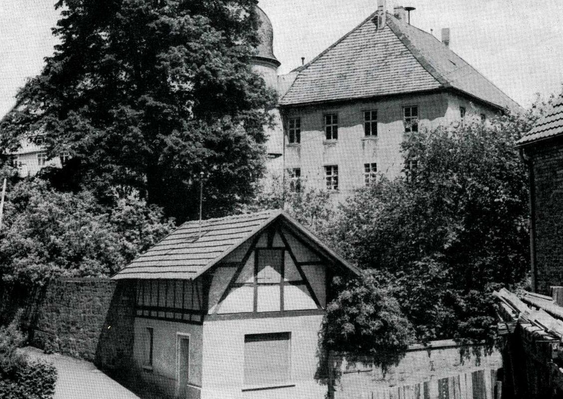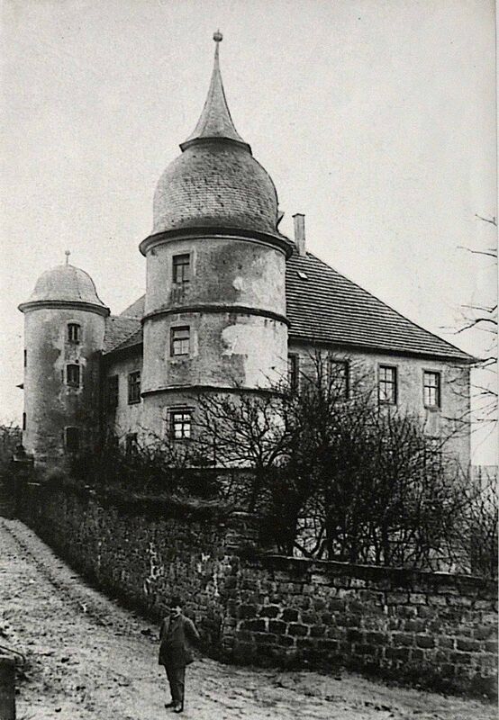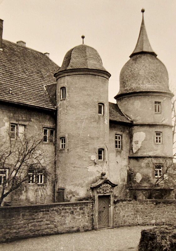 Das Schlösschen in den 50ern. Hier sieht man sehr schön auch den früheren Schlosseingang/Portal, über dem das Wappen des Fuldaer Fürstabts Konstantin von Buttlar (1714-1726) angebracht ist.