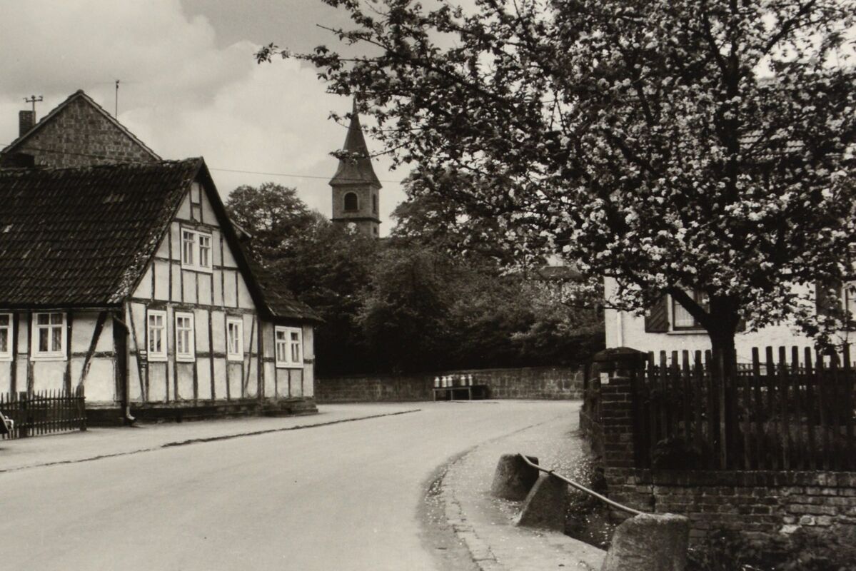 Spezielle Blickachse! Vom Kirchturm her sieht man das Schlösschen im Zustand der 50er Jahre. Links der Giebel der „Öwerwertschaft“, die damals noch im Besitz der Familie Hartung ist. Darüber – links – lugt „Dewesse“ heraus. Hier hatte der langjährige Bürgermeister Wilhelm Bernhard u.a. seine Amtsstube. Am oberen Ende der Fotografie – links – sieht man: nix ! Heute ist hier die Munkenstraße und inzwischen gut ausgebaut. Die ehemalige Domäne sieht man in der rechten, oberen Bildecke.