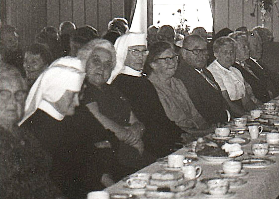 Kaffeekränzchen. Was für ein Foto – mit diesen tollen Eichenzeller Charaktergesichtern. Wir sehen v.l.: „ Zaiesch Moarche“, die Herzdame von „Schelle Franz“ – Franz Müller - daneben Schw. Iduara. Verdeckt ist Schw. Silesia. Und dann sehen wir Fr. Hanselmann, Pfarrer Heims „Gute Seele“ für Haushalt, Hof und Garten - gefolgt von Schw. Maria-Luise. Auch dabei sind Sophie und Wilhelm Schäfer, Eltern des unvergessenen Josef Schäfer, der in der Gemeinde und auch als Küster, viele Jahre tätig war. Die Dame im weißen Blüschen ist Therese Laibold - Mutter von „Schmiede Helmut“ – H.Laibold
