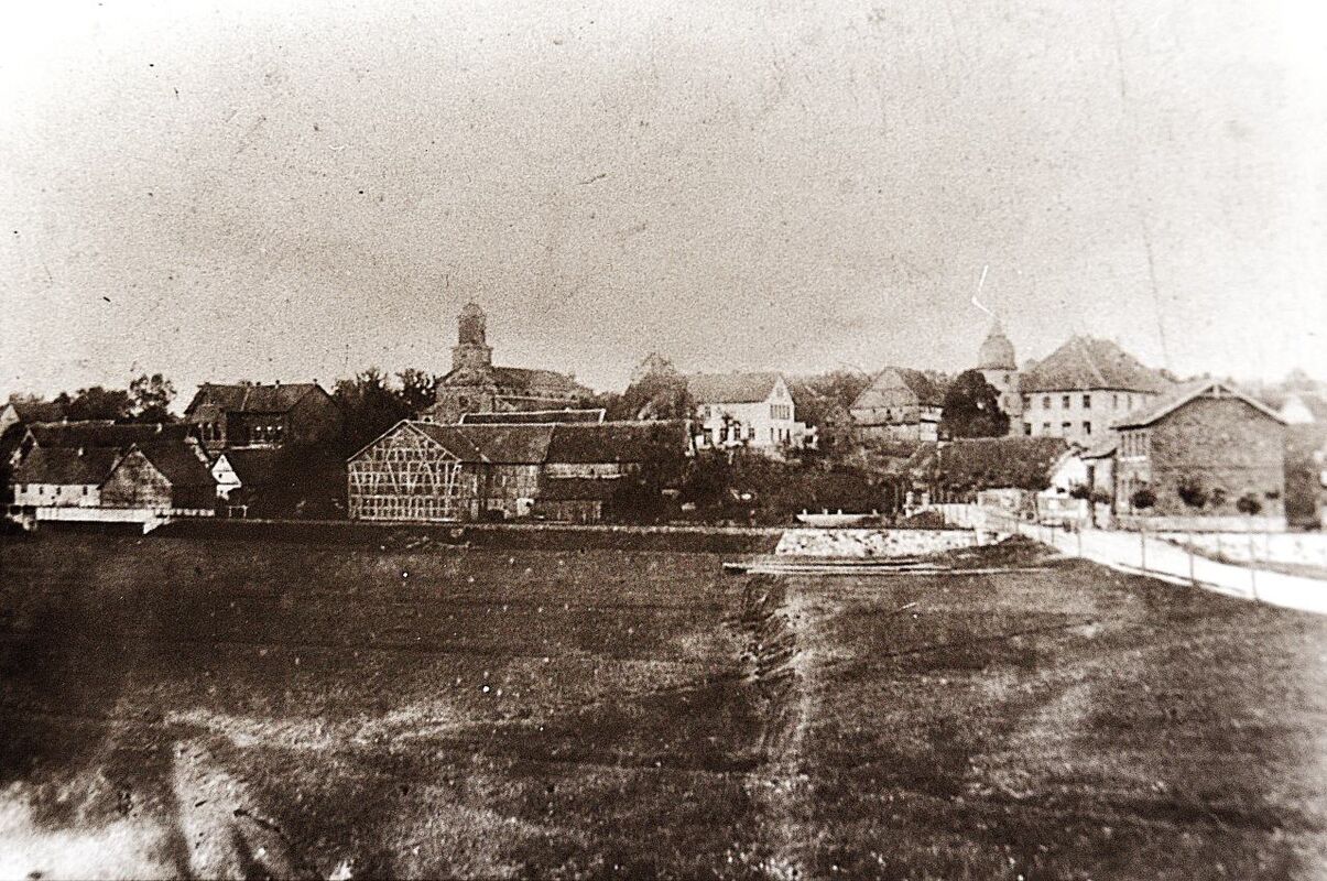 Im Vordergrund dieser ältesten Aufnahme sehen wir unbebautes Gelände - die „Betz-Aue“, eine Wiesenfläche, die damals noch zur Eichenzeller Domäne gehörte. Diese verkaufte nach 1900 einige Landstücke, sodass in der Löschenröder Strasse (Sachsenhausen) gebaut werden konnte!