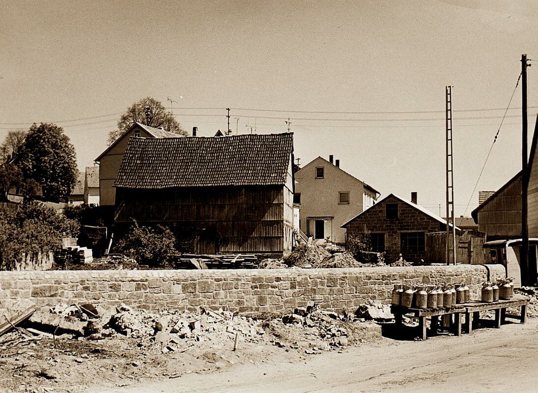 Hier ein „Milchkannenstützpunkt“ an der Einbiegung zur hist. „Sandgass“ – der heutigen Turmstrasse. Wir sehen auch die längst verschwundene Scheune, gegenüber der Alten Schmiede, in der einst u.a. der Eichenzeller Leichenwagen untergebracht war. Die Aufnahme stammt aus dem Jahr 1967, denn die Schlossmauer ist im Zuge der Strassenverbreiterung schon nach hinten versetzt – was hier schön zu sehen ist. Parallel laufen die Vorbereitungen für den Umbau des Schlösschens – 1969/70/71
