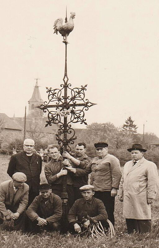Mit Hilfe der amerikanischen Streitkräfte – lange in Fulda stationiert – wurde die Kirchturmspitze per Hubschrauber heruntergeholt und restauriert. Ganz oben „ operierten Dachdeckermeister Otto Gruß, sein Sohn im 2. Lehrjahr Otti und Mitarbeiter ´Hütsche Emil`.