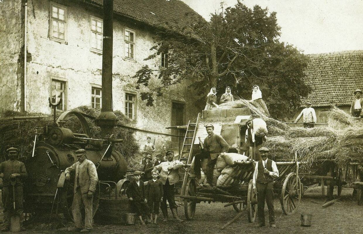 Am Hof. So wurde das Areal der früheren Domäne im Volksmund genannt. Gemeint war in der Regel aber das Herrenhaus. Wir sehen hier Menschen und Maschinen im Saisonalltag. Auf der linken Seite sind die Brüder Latsch als Heizer (links) und Maschinenführer zu sehen. Eine berühmte Eichenzeller Aufnahme von einem unbekannten Fotografen, der wahrscheinlich um 1900 von Lehrer Zentgraf beauftragt wurde, Eichenzell abzubilden.