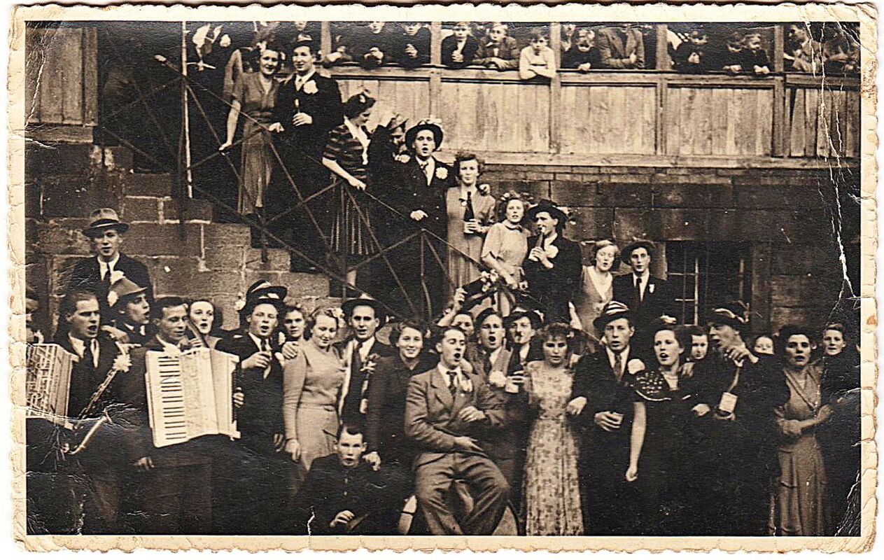 Eine fesche Kirmestruppe auf der Treppe bei „Werts“- Gasthaus Kramer. Die „Loge“, am oberen Bildrand, ist gut besucht und Teil der beliebten Weinlaube.