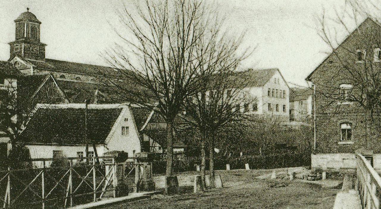 Noch hat unsere Pfarrkirche einen „Deckel“ auf dem Turm. Also ist`s eine Aufnahme von vor 1907. Schön zu sehen ist die Mühlgrabenbrücke, mittig die alte Schule, rechts „Schäbbe“ und links, mit weißem Giebel s`“Stey`s Hüsee“.