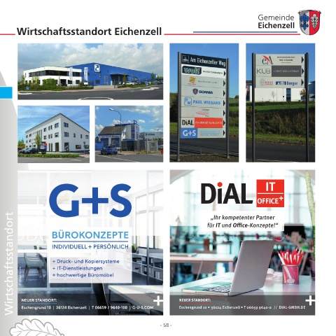 Gemeinde Eichenzell Wirtschaftsstandort Eichenzell Wirtschaftsstandort „Ihr kompetenter Partner für IT und Office -Konzepte!“ NEUER STANDORT: Eschengrund 10 •36124 Eichenzell •T 06659 9640-0 // DIAL-GMBH.DE - 58 -